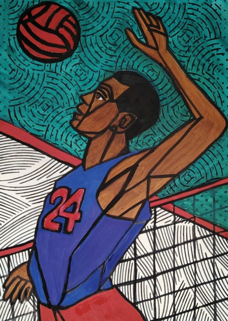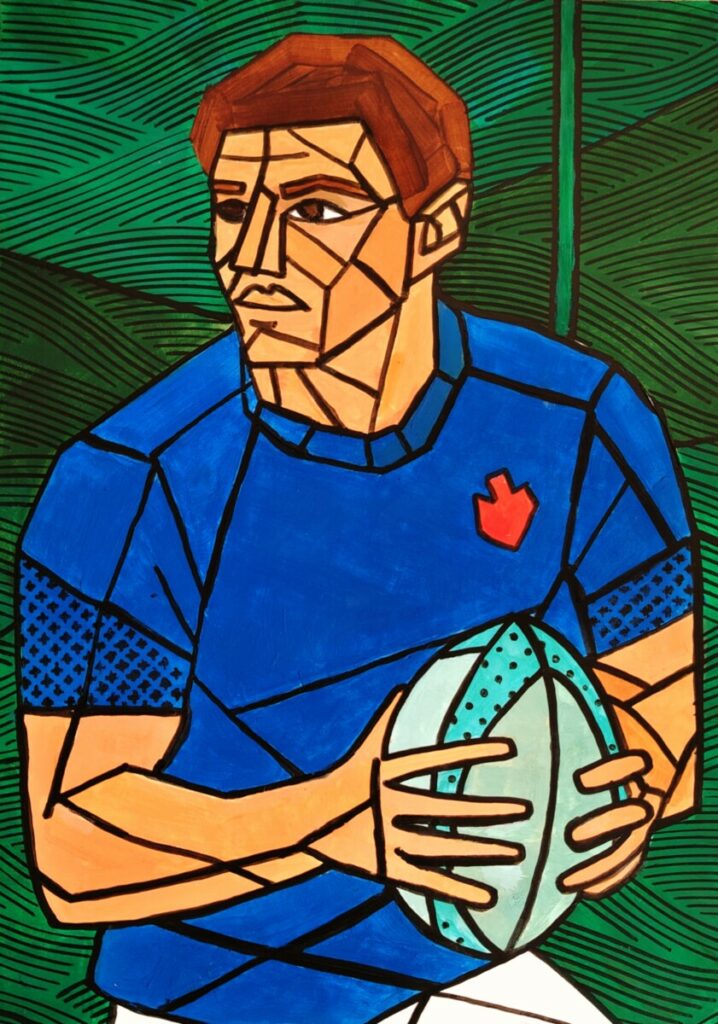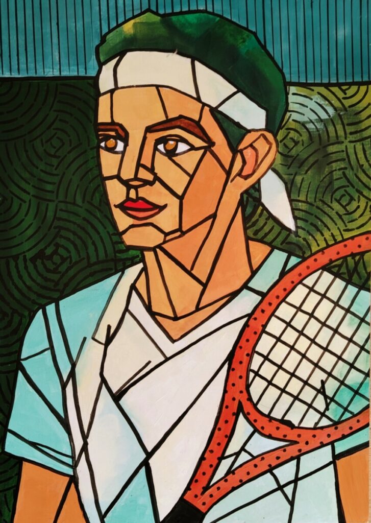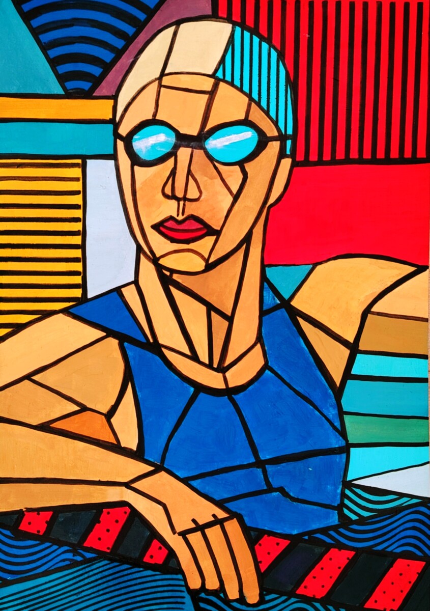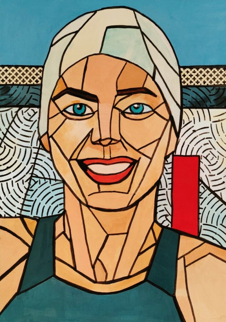 Après quelques errances — des peintures plus classiques de portraits ou paysages — j’ai choisi d’explorer la géométrie (comme d’habitude 😉) et de représenter des sportifs, pour commencer. L’idée m’est venue en regardant un reportage sur le parcours sportif de Laure Manaudou. Créer cette série bien colorée a demandé beaucoup de rigueur, de patience et de précision… mais quel amusement ! 🤩