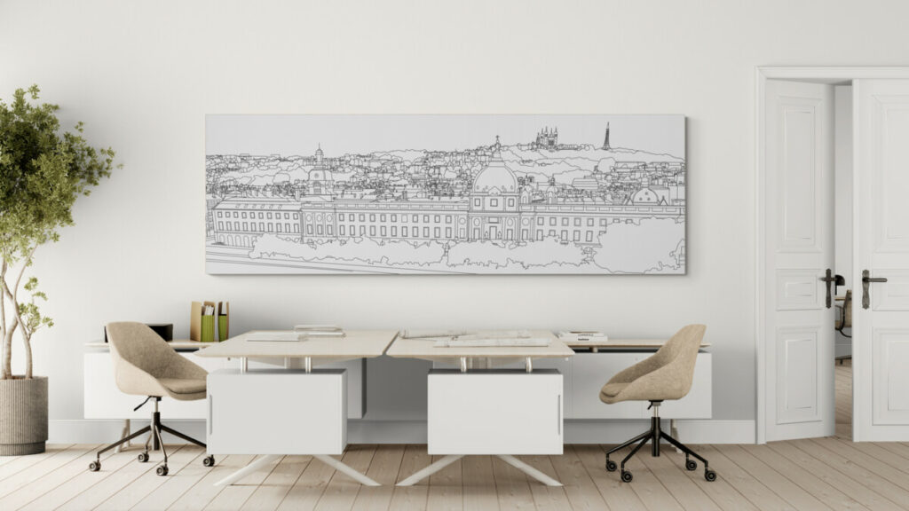 Bonjour, j’ai récemment démarré une commande pour un tableau de 3 mètres de long, pour des particuliers. Ils m’ont transmis deux angles de vue de Lyon très différents à partir desquels je vais leur proposer une représentation colorée. La base du premier dessin est tout juste terminée. En dimension, voilà ce que ça donne